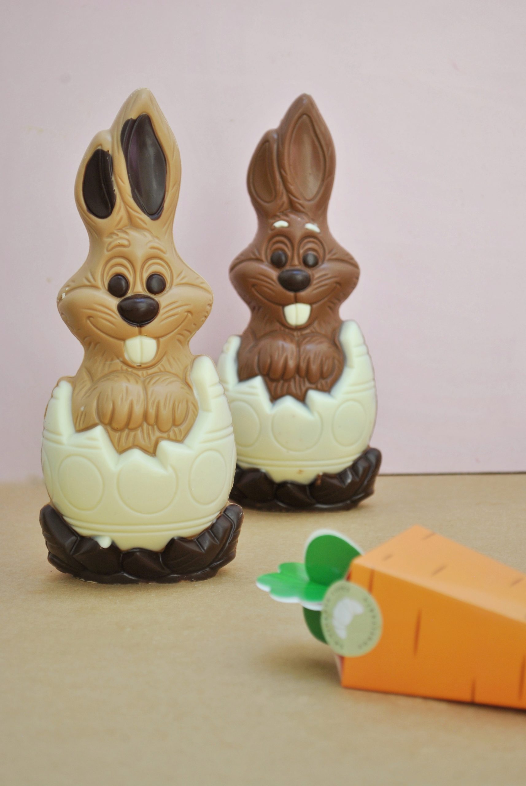 Figura de conejo de 180grs., en dos versiones: chocolate con leche o chocolate gold, con detalles en chocolate blanco y semi amargo.