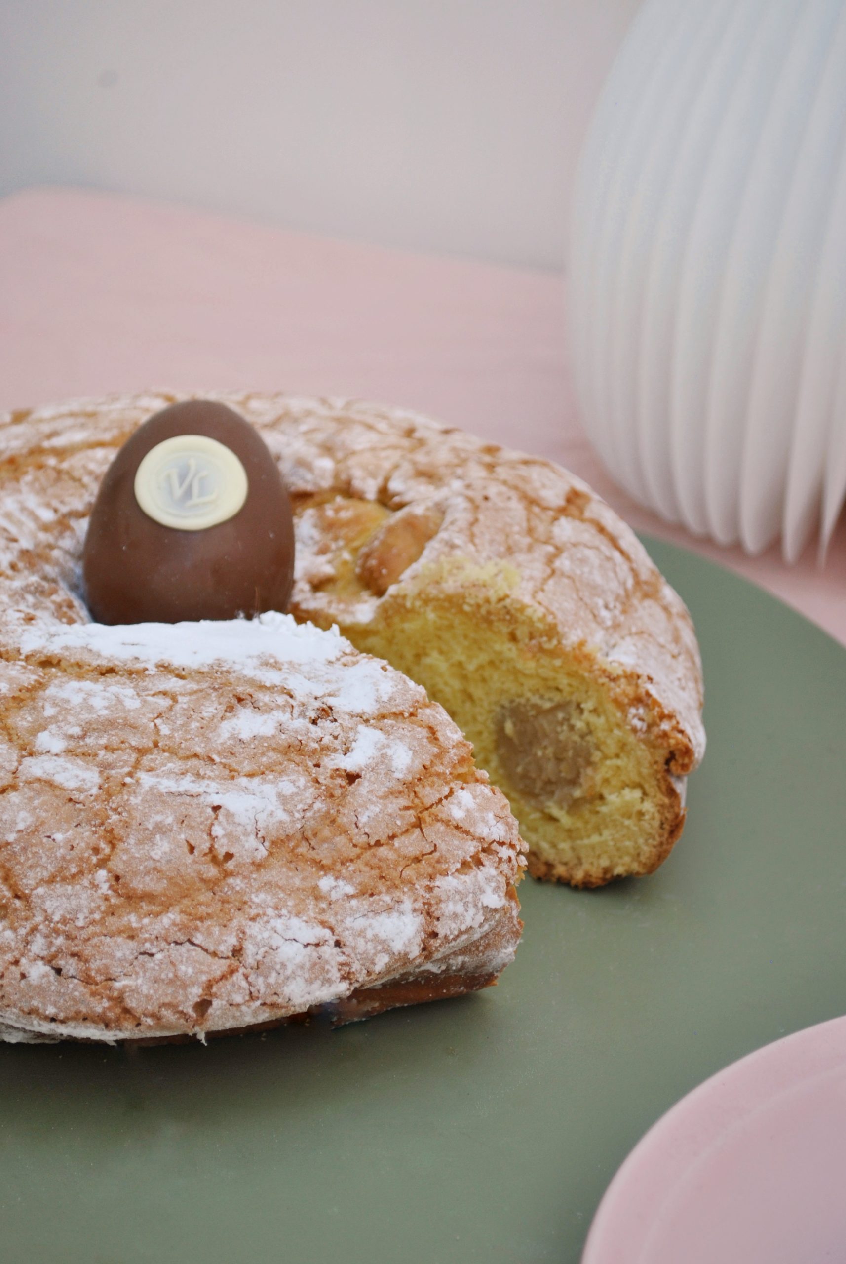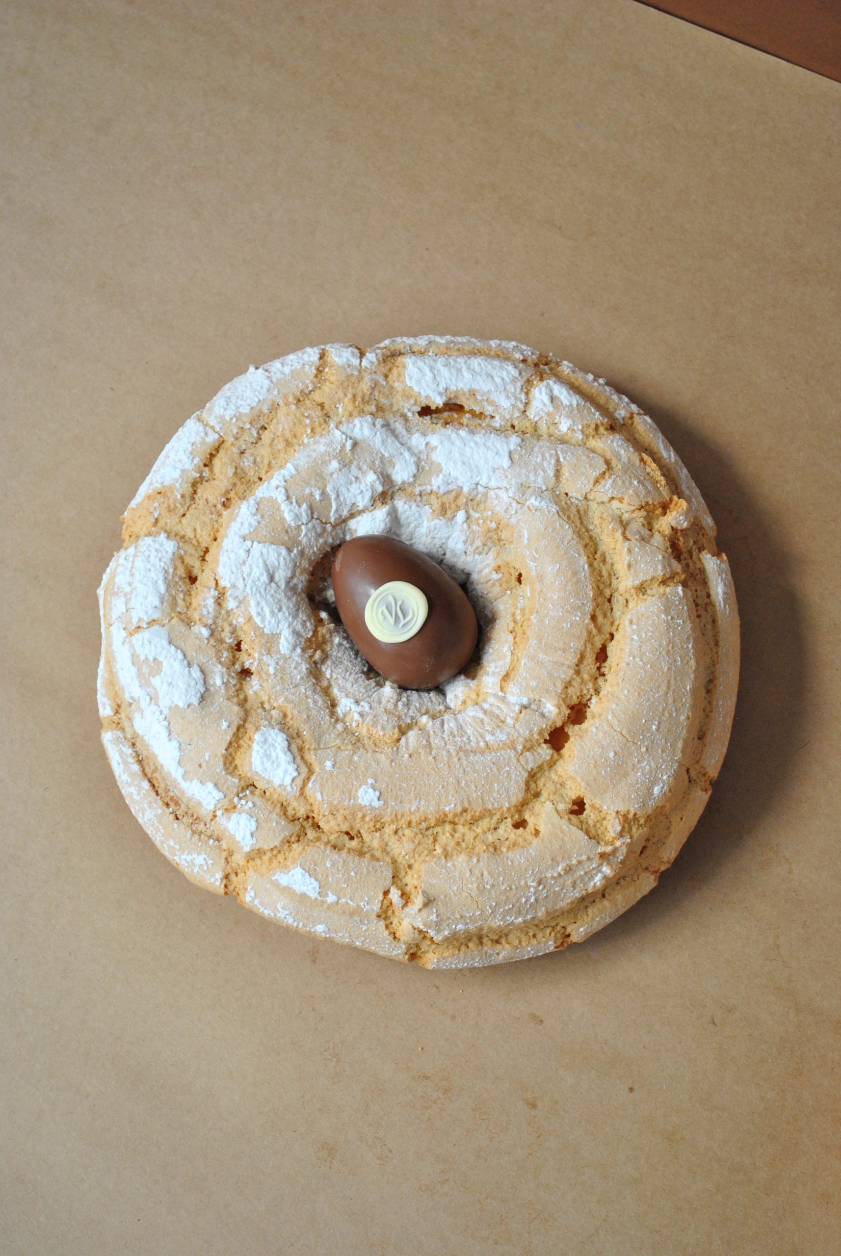 Rosca de Pascuas con pasta almendras. Cobertura de crocante de almendras. Incluye un huevo de chocolate con leche de 55grs. Rinde 10 porciones aproximadamente.